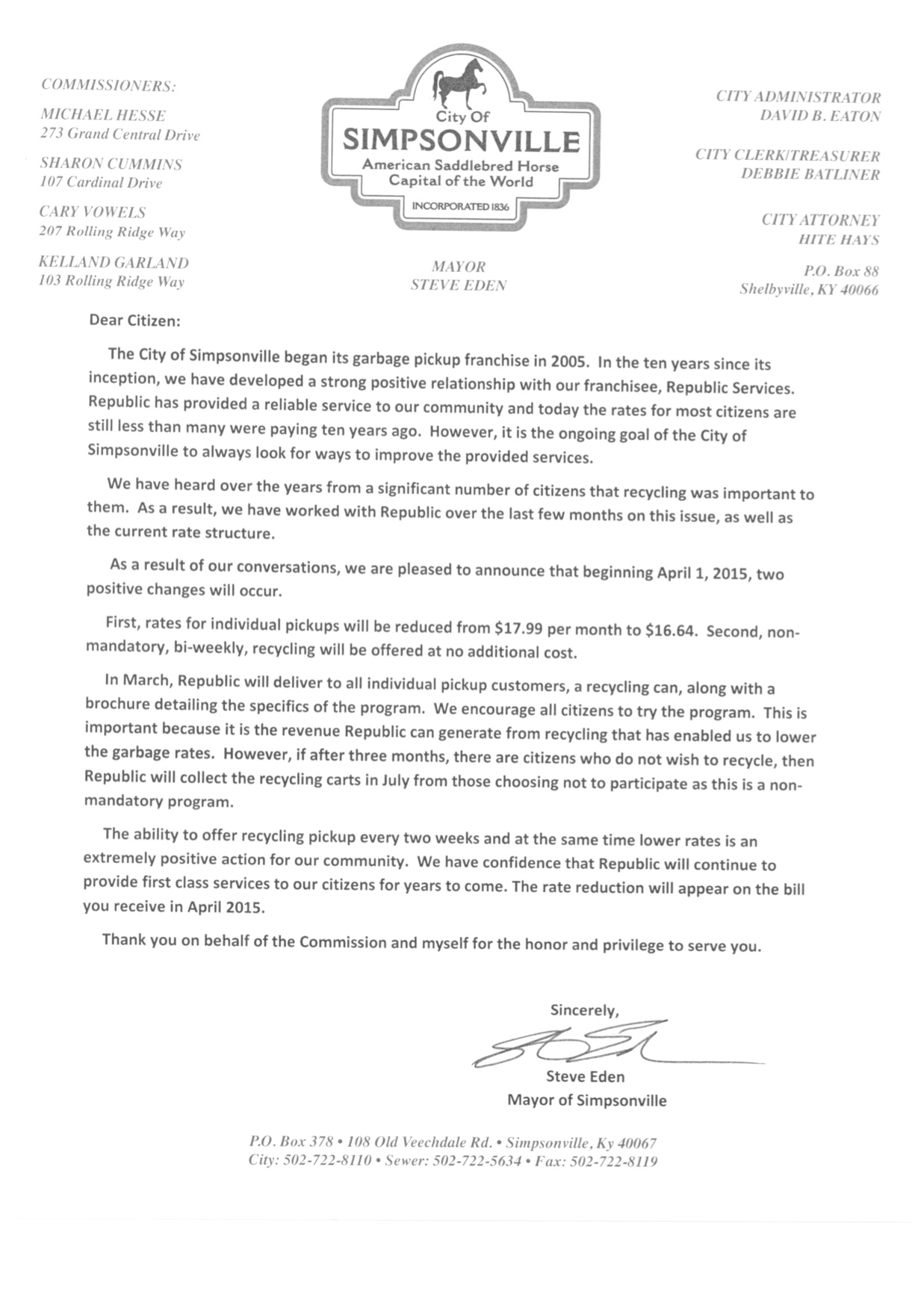 It is finally happening, Recycling in our small town of Simpsonville KY.